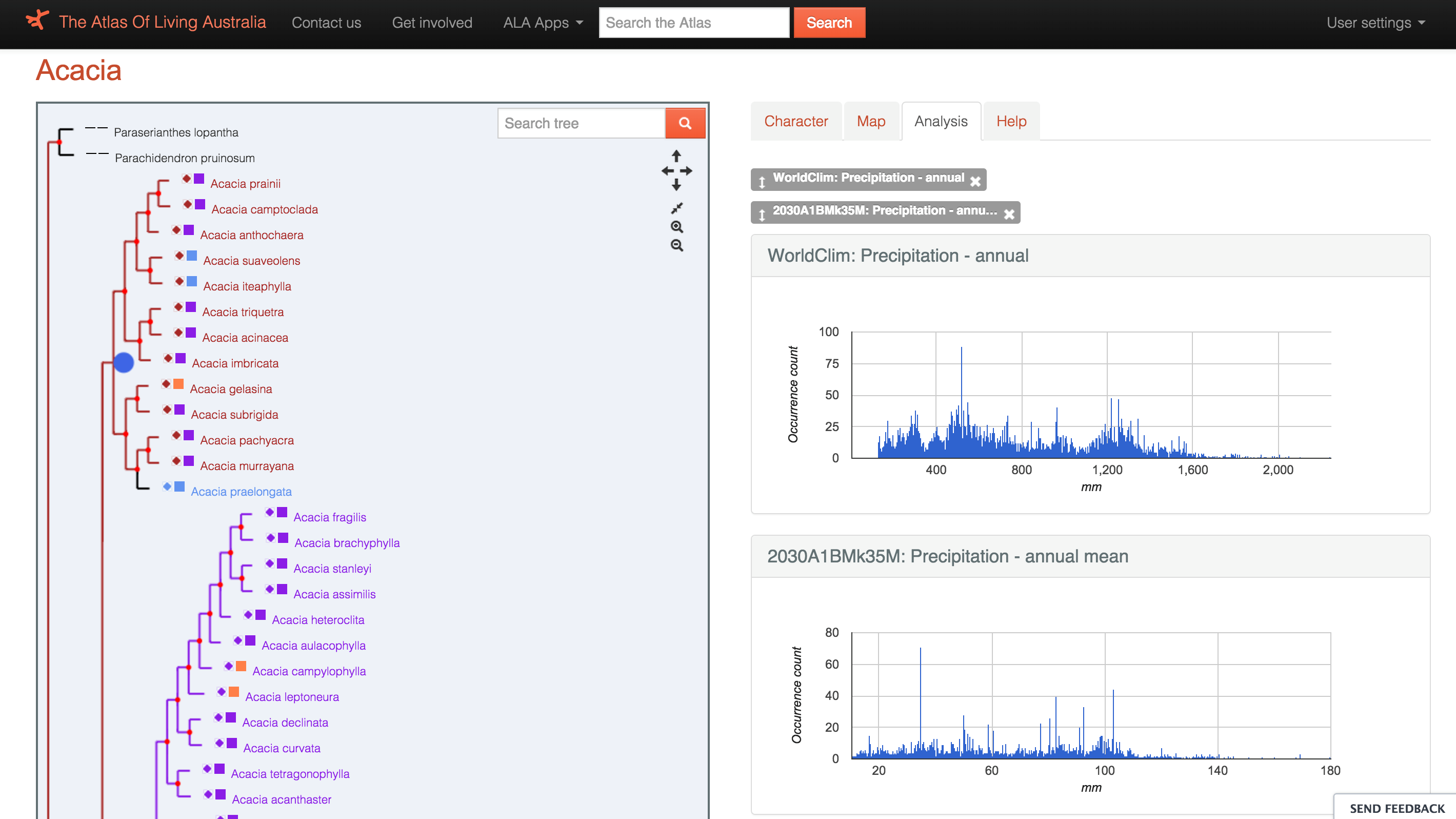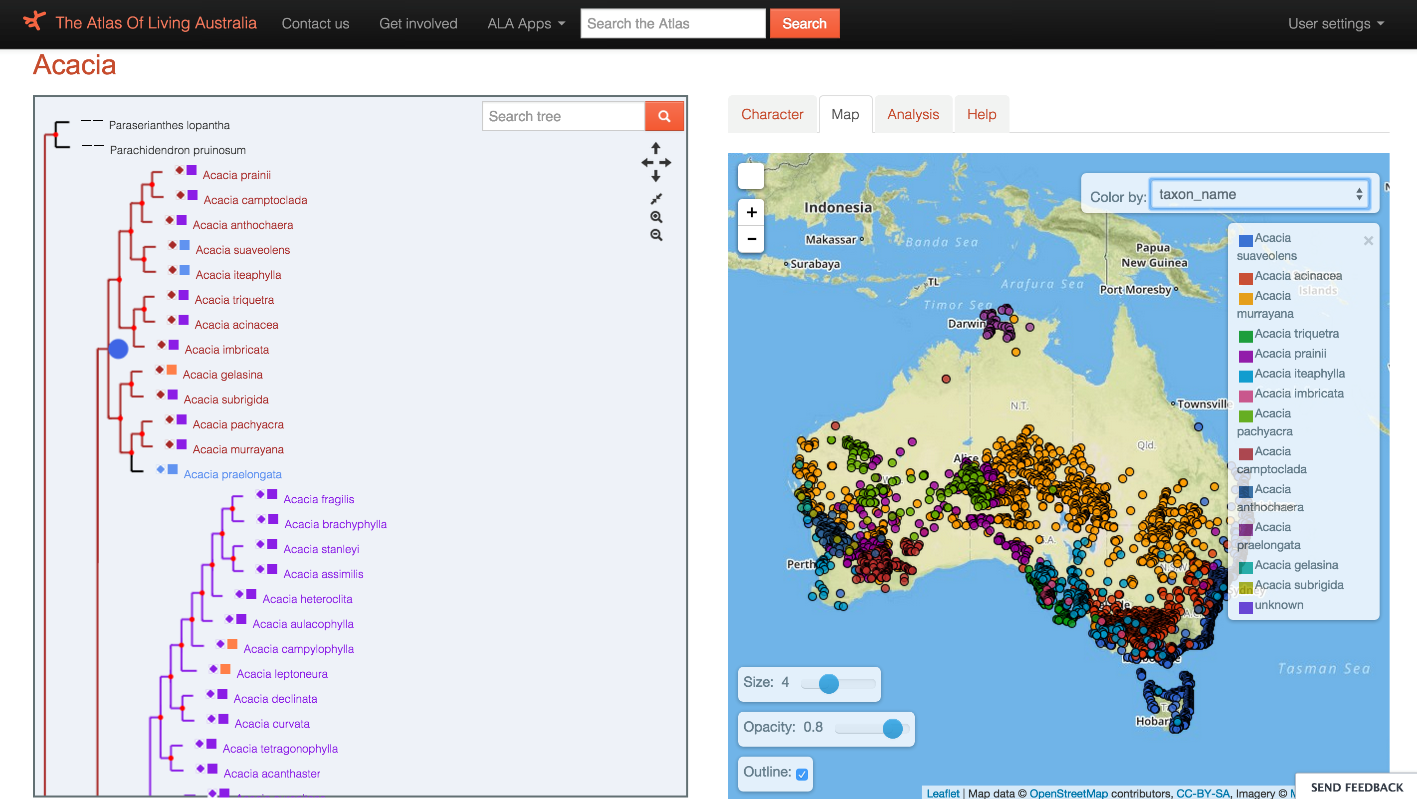 ALA’s new phylogenetic tools integrate phylogenetic trees and spatial mapping so that phylogenies can be represented spatially by, for example species occurrence or character. Here, the occurrence of Acacia species from the clade highlighted by the blue node is mapped and coloured by species.