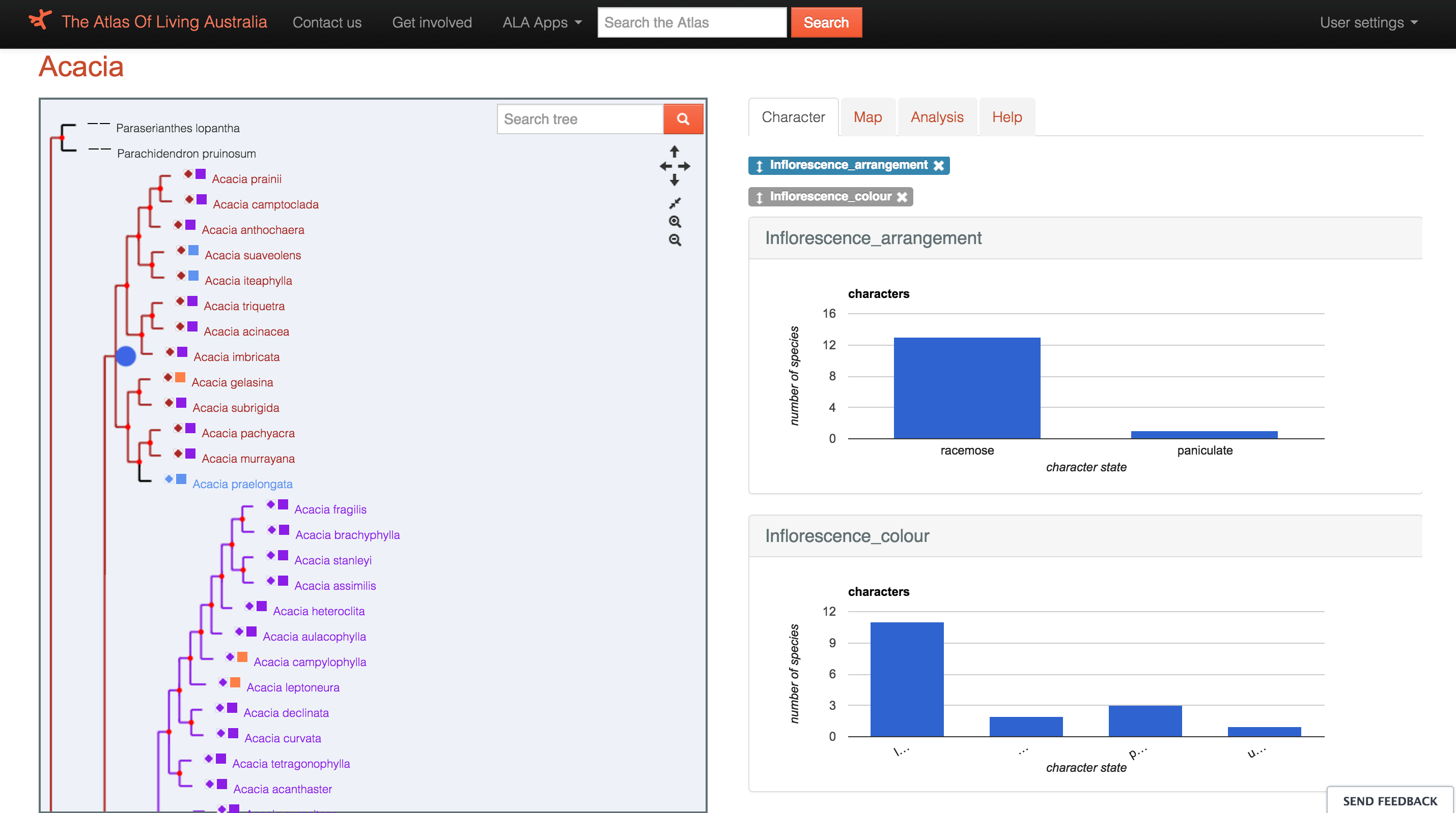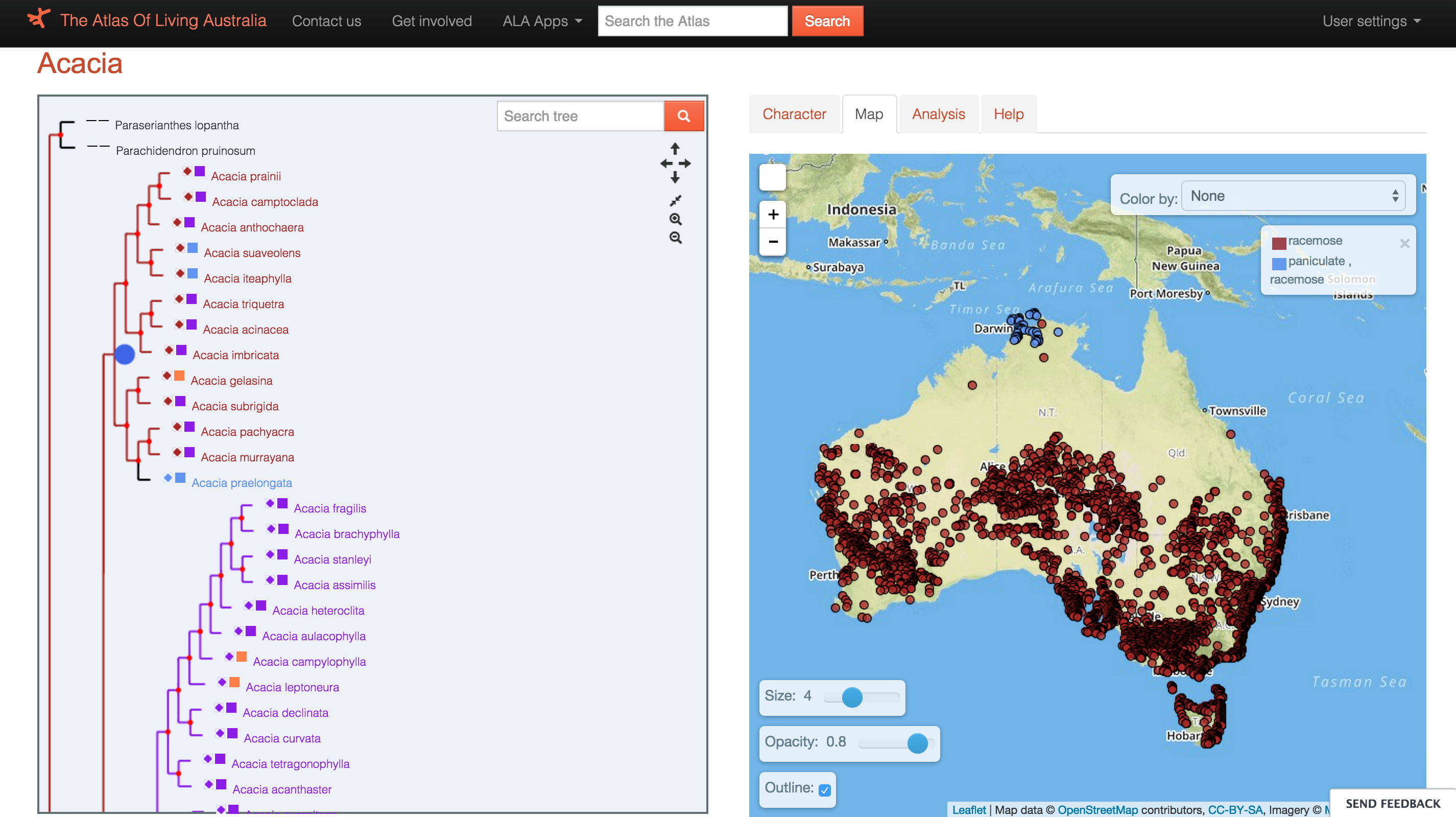 ALA’s new phylogenetic tools integrate phylogenetic trees and spatial mapping so that phylogenies can be represented spatially by, for example species occurrence or character. Here, the occurrence of Acacia species from the clade highlighted by the blue node is mapped and coloured by inflorescence arrangement.