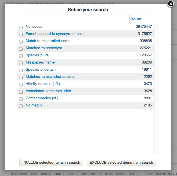 Detecting for duplicate occurrence records is one of the tests performed during data processing. If a potential duplicate is detected, the record is flagged which then allows users to optionally discard duplicates records from searches, analysis and mapping. A discussion by Simon Bennett on duplicate records is available here. Duplicates may occur in observational data due to historical data merging between datasets. For specimen data, “duplicate” may be inaccurate as there may be multiple specimens taken from the same individual or multiple specimens taken as part of the same collection event.