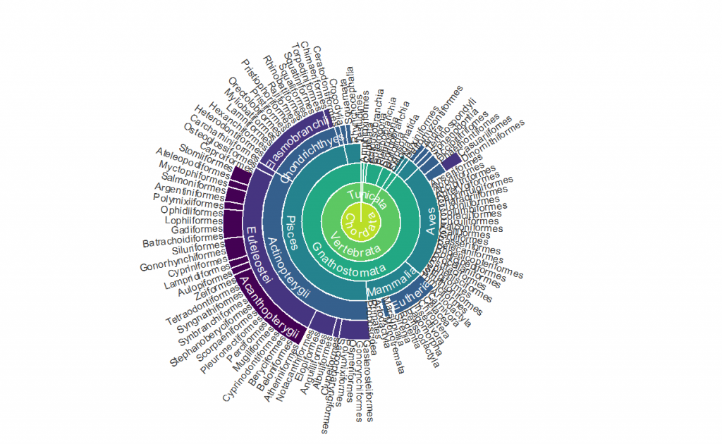 This visualisation of ALA’s taxonomy was created by Dr Martin Westgate in R using {galah} and {ggplot2}. The full details of how to recreate this analysis and visualisation are available on labs.ala.org.au.