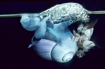 Lepas pectinata (barnacle) attached to Janthina janthina (snail), Photo: Clay Bryce, Western Australian Museum