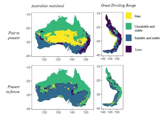 For more information, read the full journal article Past and future potential range changes in one of the last large vertebrates of the Australian continent, the emu Dromaius novaehollandiae