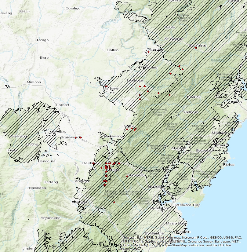 The Eurobodalla region spans along the NSW south coast and encompasses cool temperate rainforest gullies, seaside dunes, sandstone heaths and tall sclerophyll (trees with hard, short leaves) forests, grasslands and an ancient Gondwana forest. The recent devastating bushfires burnt up to 80% of the Eurobodalla region, including many of the wetter habitats previously untouched by fire. A staggering 33% of the region is currently assessed as being burnt at the highest intensity, with the forest canopy fully affected.
