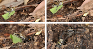 Laurence’s images show a leafcutter bee bringing a piece of cut leaf back to an apparently ‘disused’ underground burrow. But, a predatory wolf spider was already living there. For three days, Laurence watched the leafcutter bee returning with cut leaves and pollen to build and provision her underground shared home. The bee and spider frequently interacted with each other but the spider never showed aggression towards the bee.