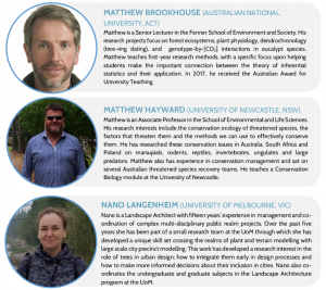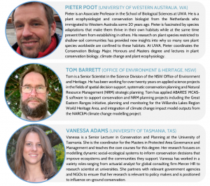 • Species Distributions & Climate Change: addresses the fundamental aspects of modelling species distributions and how a changing climate might affect biodiversity, and how to run these models in the Biodiversity and Climate Change Virtual Laboratory (BCCVL).