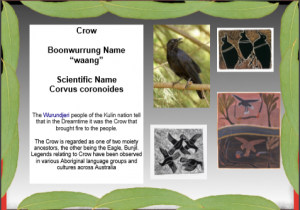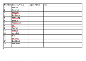 Note: All Boonwurrung language references were given to Geoff Guymer, CSIRO, by Auntie Fay Stewart-Muir, Victorian Aboriginal Corporation for Languages to be used as educational tools.