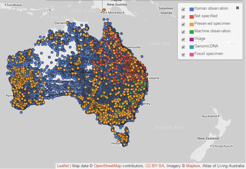 The Atlas of Living Australia website has been operating since 2010 and provides free, online access to a vast repository of information about Australia’s biodiversity. It supports research, environmental monitoring, conservation planning, biosecurity activities, education, citizen science, and the digitisation of millions of existing physical records around the country. The Atlas has over 54 million records on approximately 110,566 Australian species (as at May 2015 and growing rapidly), these records can be investigated through individual species profiles containing photos and collections data, and by using the mapping and analysis tools developed by the Atlas.