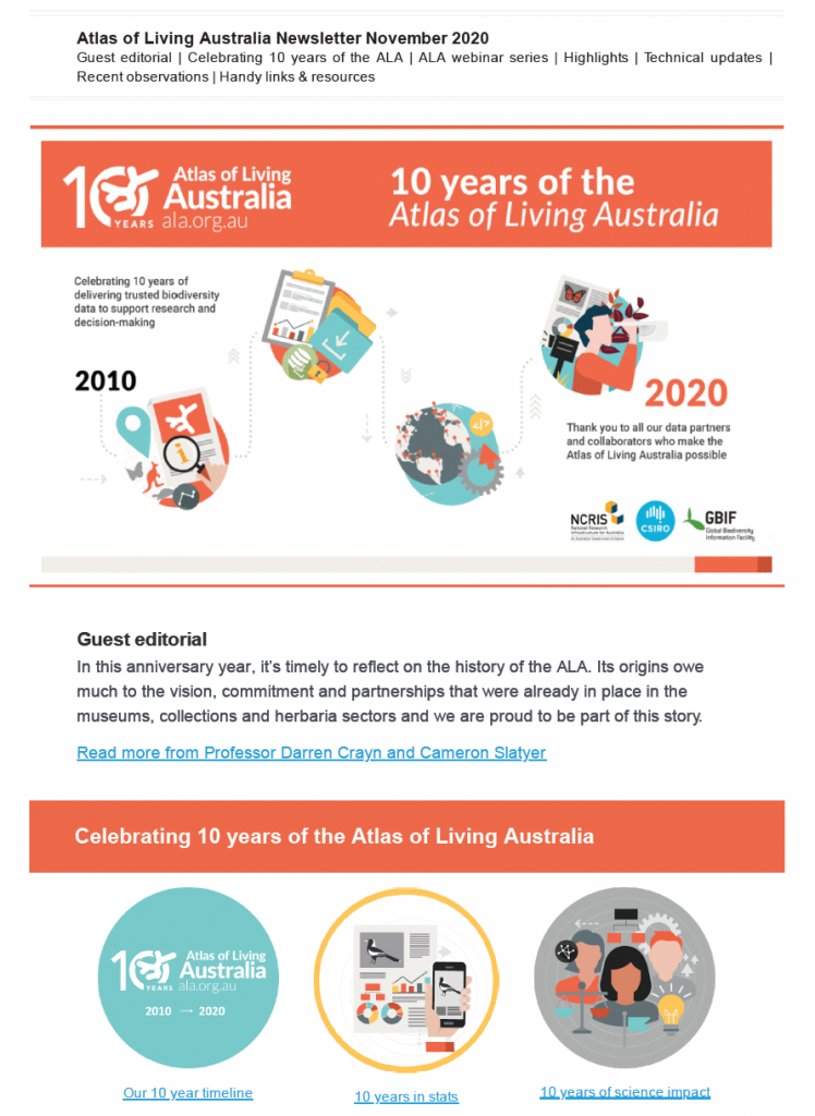 Ten years ago, Australian national collections, science organisations, and government agencies saw the opportunity for a national online and open data repository for biodiversity data. The Atlas of Living Australia (ALA) was established with funding from the Australian Government’s National Research Infrastructure Strategy (NCRIS) to fulfill this role and aggregate Australia’s biodiversity data.