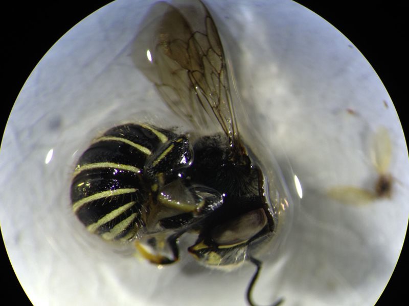 The initial image of the male specimen was taken in alcohol, looking down one eyepiece of a microscope with an iPhone – an impressive photograph and certainly good enough for species identification (as there is no native megachilid bee in Australia with these distinctive yellow colour markings). The photographed specimen is now in the collection of Museum Victoria.