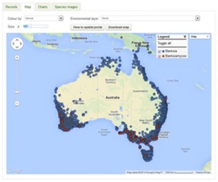 AVH map showing the distribution of the fungus Banksiamyces (red dots) and its host Banksia (blue dots), based on label data from specimens held in Australian herbaria. Image: Australia’s Virtual Herbarium (2014).