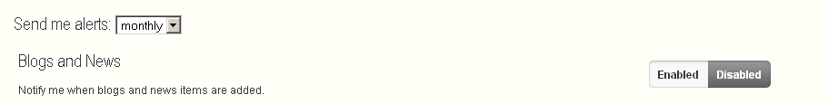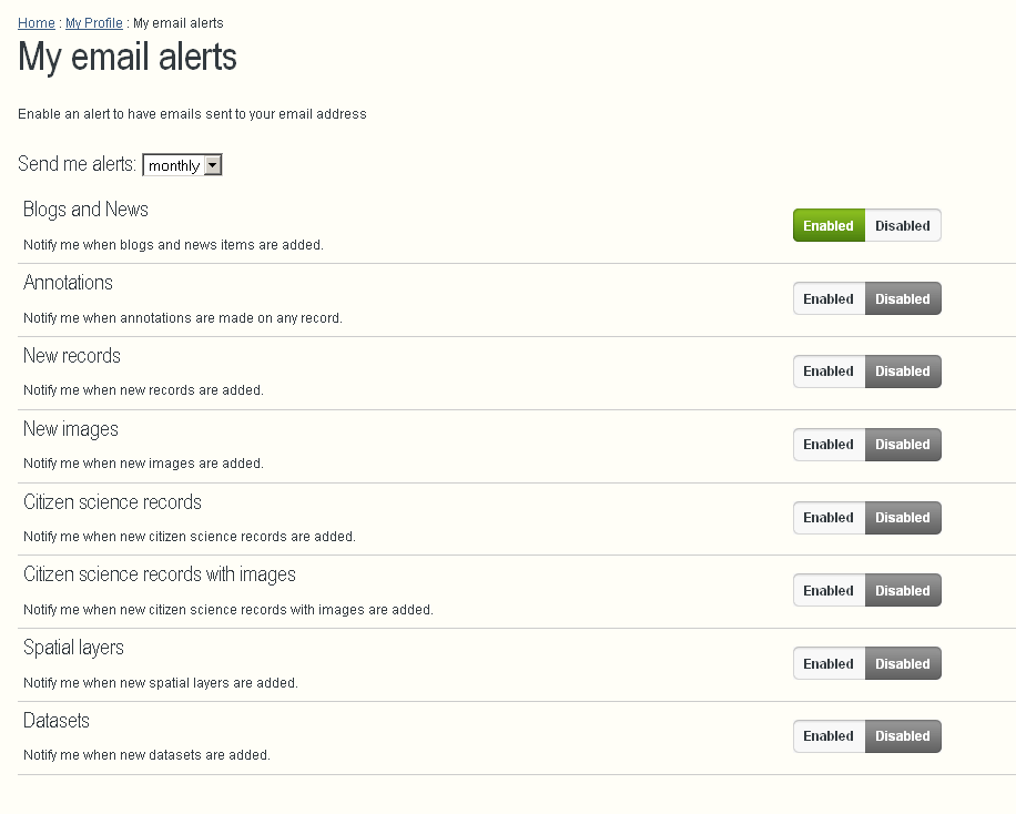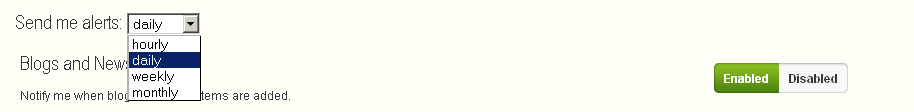 It is as simple as clicking on Manage email alerts, choosing the frequency in the pull down list and clicking on the alert buttons you require to ‘Enabled’ or ‘Disabled’.