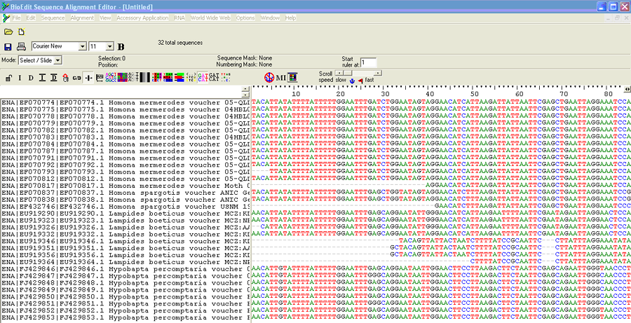 Data imported into the alignment package (BioEdit) using the FASTA file download option.