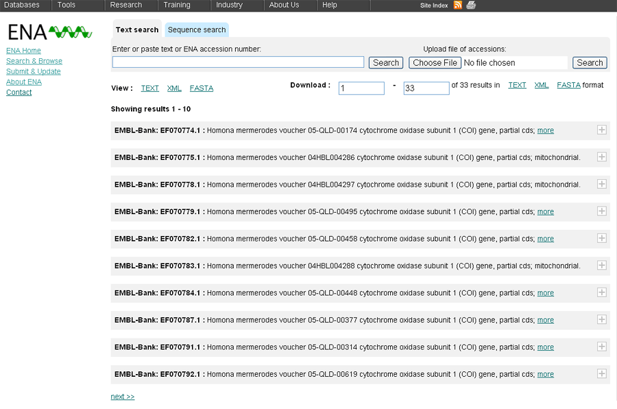For ‘European Molecular Biology Laboratory Australian Mirror’ records, click on the More details link. You will be taken to an individual EMBL record in the European Nucleotide Archive.