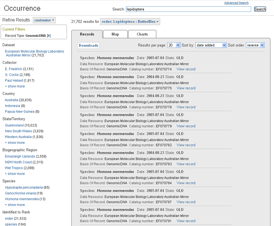 If you are interested in a particular data set, for instance those containing molecular data e.g., the ‘European Molecular Biology Laboratory Australian Mirror’ or ‘BOLD – Australia’, then one way to access their records is to find the data set, view and then optionally download the associated occurrence records.