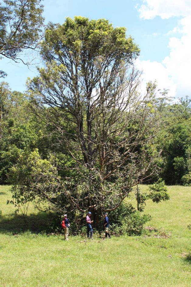 Repeated myrtle rust infection has almost killed this 100-year-old Sour cherry tree (Syzygium corynanthum) in the Tallebudgera Valley – Photo Credit Geoff Pegg, Queensland Department of Agriculture and Fisheries.