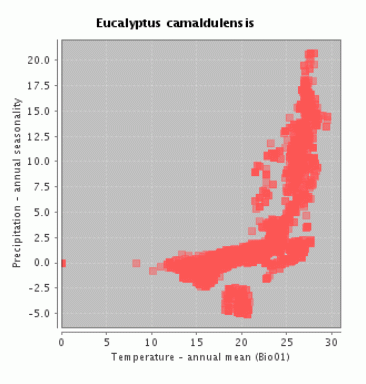 The scatter plot tool requires three choices to be made – the species to be analysed and a selection of two environmental layers to provide values for the scatterplot. Here is the scatter plot for Eucalyptus camaldulensis localities based on “Precipitation—annual seasonality” and “Temperature—annual mean (Bio01)”: