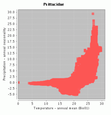 Some species of parrot can be found just about everywhere in Australia and the scatter plot therefore shows us the whole spread of environments which can be found in Australia. There is no discontinuity in this scatter plot, which suggests that there is indeed something significant about the discontinuity in Eucalyptus camaldulensis distribution. A possible enhancement to the scatter plots would be to colour the background to indicate which environmental combinations are possible within Australia.