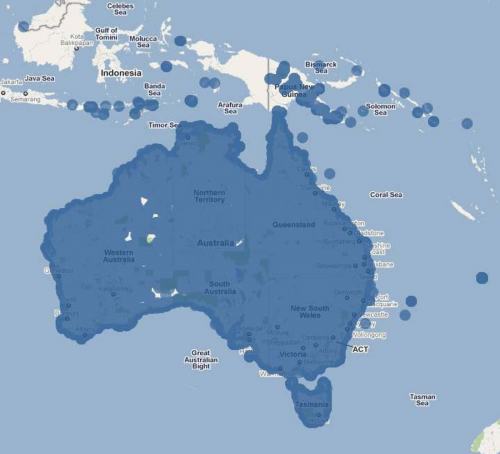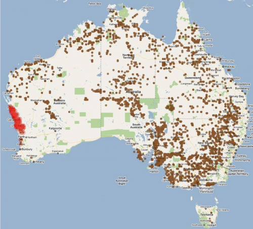 Another possible answer could be that what we are seeing is simply a result of Australian geography. It could be that the Australian landmass does not include any areas with intermediate environments of this kind. This can quickly be disproven. Here is the occurrence map for all species of parrot (Psittacidae) in Australia, along with the equivalent scatter plot: