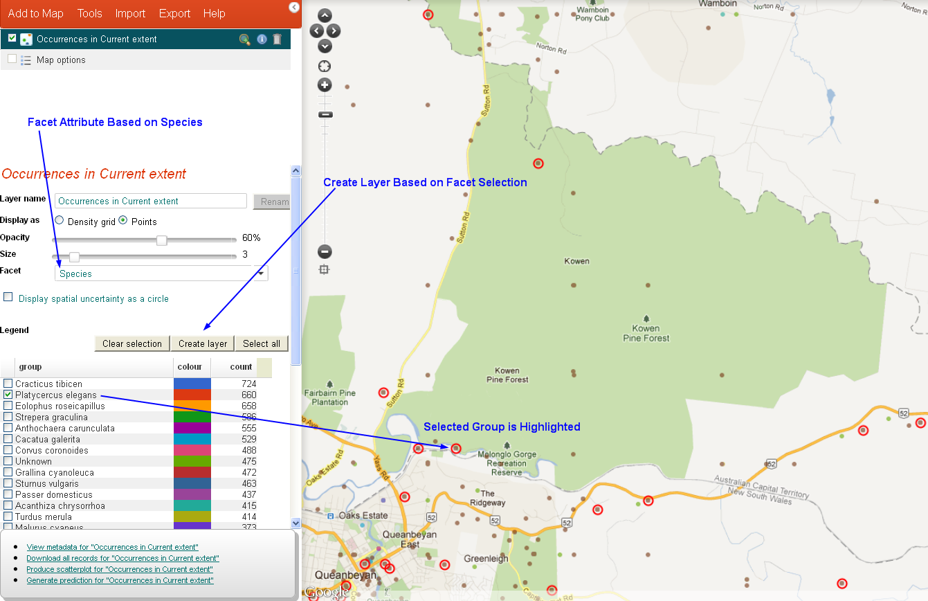 The following example shows occurrence data for all species within the current extent. It is faceted on Species name showing the occurrence points coloured by class. The species Platycercus elegans is selected using the facet class checkbox and all points of occurrence data for that species are highlighted with a red circle on the map.