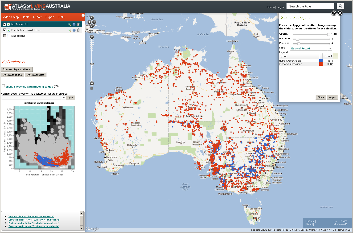 In the image below the Scatterplot is faceted on ‘Basis of Record’.