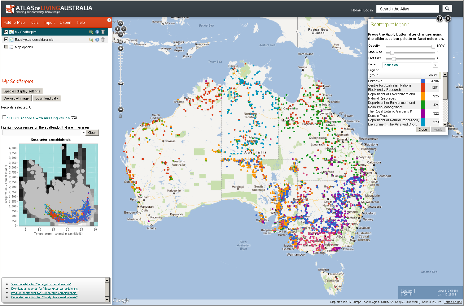A facet is an a single attribute of a species that has been indexed against all species records in the ALA’s species database; an indexed attribute. In the Spatial Portal facet classes are rendered in the legend and on the map with different colours. For example, the Atlas records have a facet called ‘Institution’ and one of the classes in this facet would be ‘Australian Museum’.