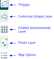 The five different types of layers can be identified by the icons to the left of the layer name. Species are usually (occurrence) points but can be polygons in the case of checklists (list of species within an area) or ‘expert distributions’. Areas are polygons. ‘Layers’ can either be contextual (polygonal) or environmental (gridded). Contextual layers contain polygons that are described by a class. For example the contextual layer called Land Use has a class called ‘Forestry’. Environmental layers have grid cells (square polygons:) that contain numeric values. For example, the layer called Mean Annual Temperatures has grid cells containing temperature values such as ‘18.8c’,