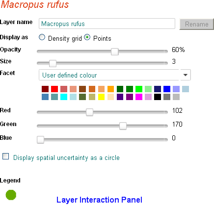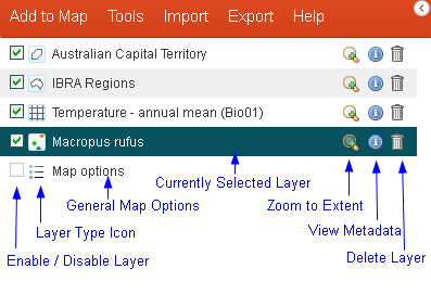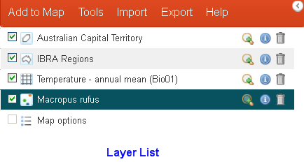 A new entry is added to the layer list for each layer added to the map; species, area or layer. All layers have a set of associated functions.