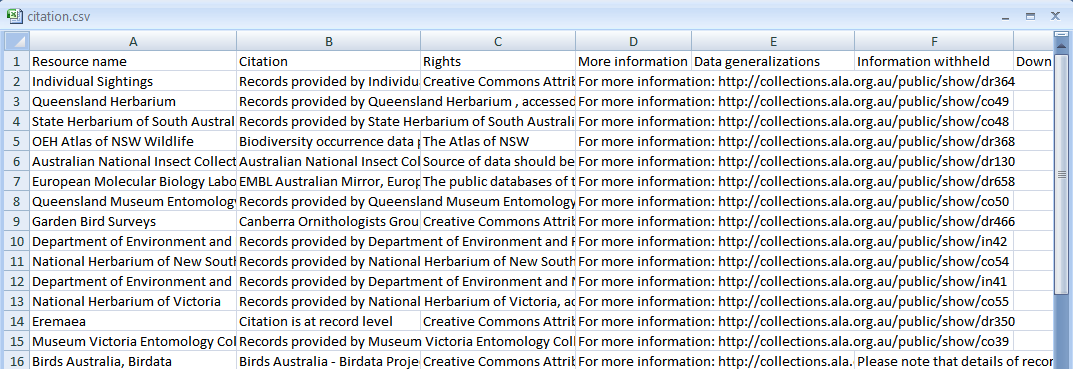 Following the selection of the layers, a zip file is produced containing the occurrence records as a data.csv file, and the citation details of each of the data providers as citation.csv.