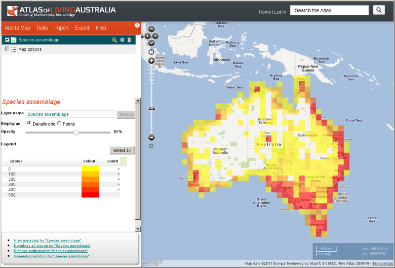 Click on the Display as ‘Density grid’ to change the map to display the species assemblage in one degree density grids. If the number of occurrences to be displayed on the map are 100,000 or over, then the map defaults to the density grid.