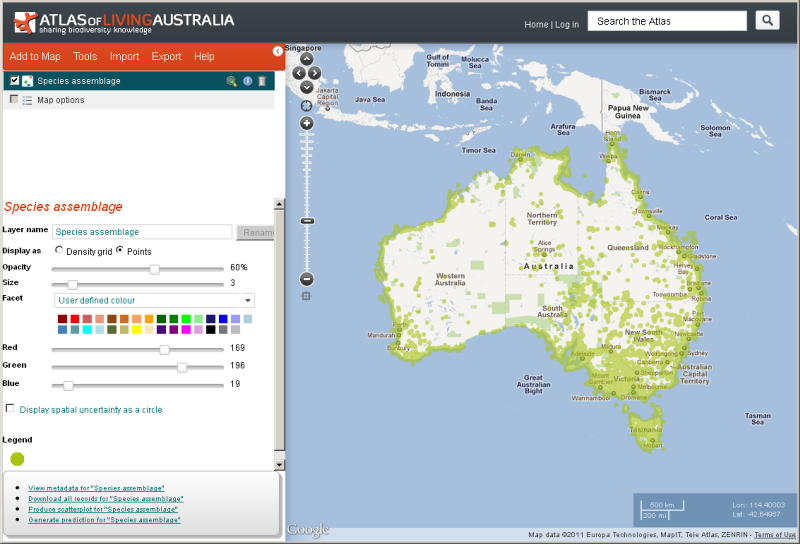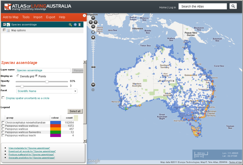 A species List is a group of taxa/species. The Spatial Portal can create this list and generate one mapped layer that can be be used in the same way as a single species layer. For example, faceting, filtering, scatterplots, prediction, points to grid, GDM and exports.