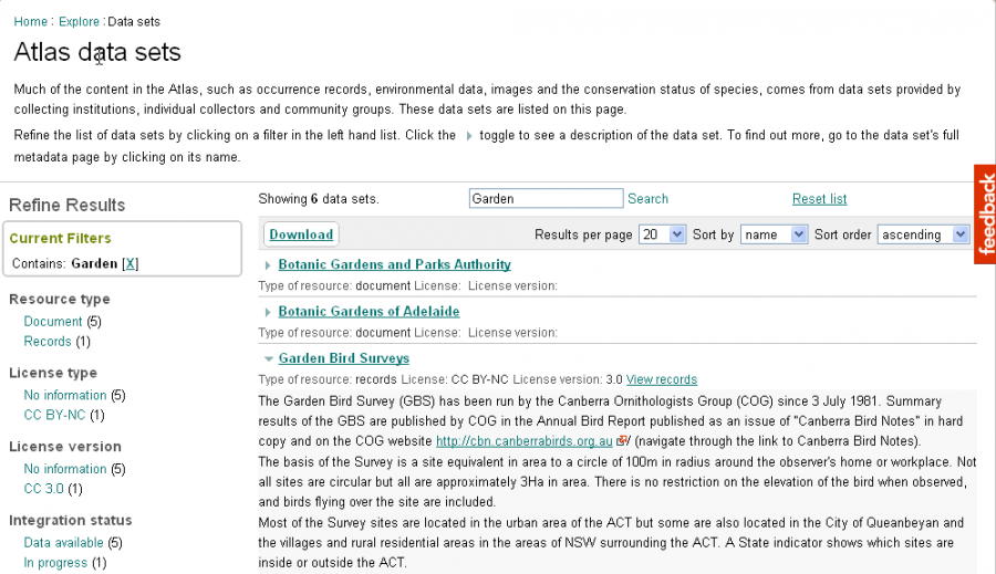 The data sets displayed on the page can be refined to facet (or filter) the results set. Click one or more options to reduce the selection. A free text search on the data set names is also available, e.g. type in “Garden”.