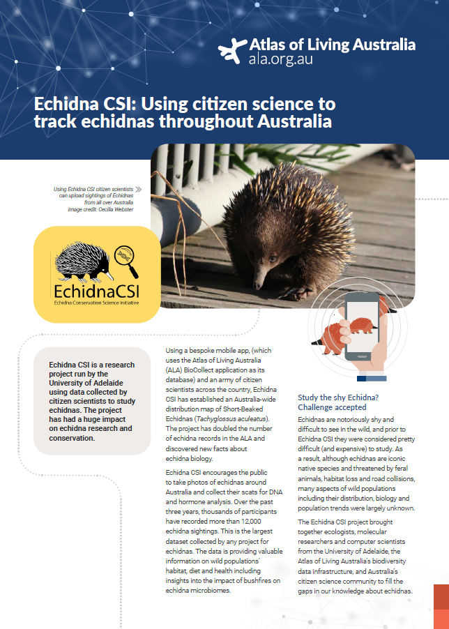 Using a bespoke mobile app, (which uses the Atlas of Living Australia (ALA) BioCollect application as its database) and an army of citizen scientists across the country, Echidna CSI has established an Australia-wide distribution map of Short-Beaked Echidnas (Tachyglossus culeatus). The project has doubled the number of echidna records in the ALA and discovered new facts about echidna biology. Echidna CSI encourages the public to take photos of echidnas around Australia and collect their scats for DNA and hormone analysis. Over the past