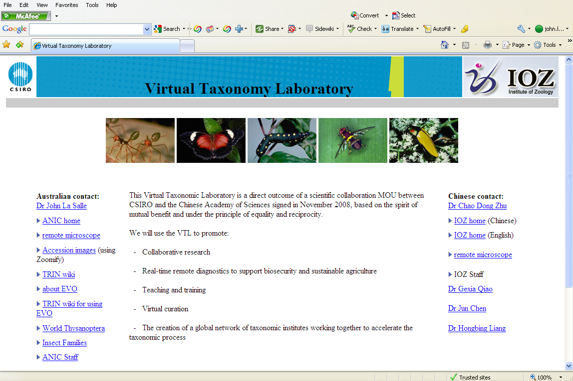 In September 2009, CSIRO and the Chinese Academy of Sciences opened a Virtual Taxonomy Laboratory (VTL) between the Australian National Insect Collection and the Institute of Zoology in Beijing.