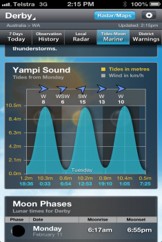We started the survey at the southern end of Exmouth Gulf on the mid-northwest coast and ended it at Derby in the northeast of Western Australia. In between, we surveyed mangrove stands at Onslow, Cape Keraudren, Derby and Point Torment (a fair indication of what to expect!). One night, we lost the main recorder to the waves. We estimated the tide from the marks on the shore but guessed wrong (see figure above). The tide was about 1m larger than expected due to the wind effect. The ‘waterproof’ box of electronics sadly wasn’t. It was an expensive lesson, but we still had our second recorder and our senses so all was not lost.