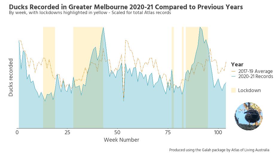 A) My project focused on the number of ducks recorded in greater Melbourne in the COVID-19 lockdown periods of 2020-2021. I was comparing them to ‘normal’ years, 2017-2019, to see if there was any difference.