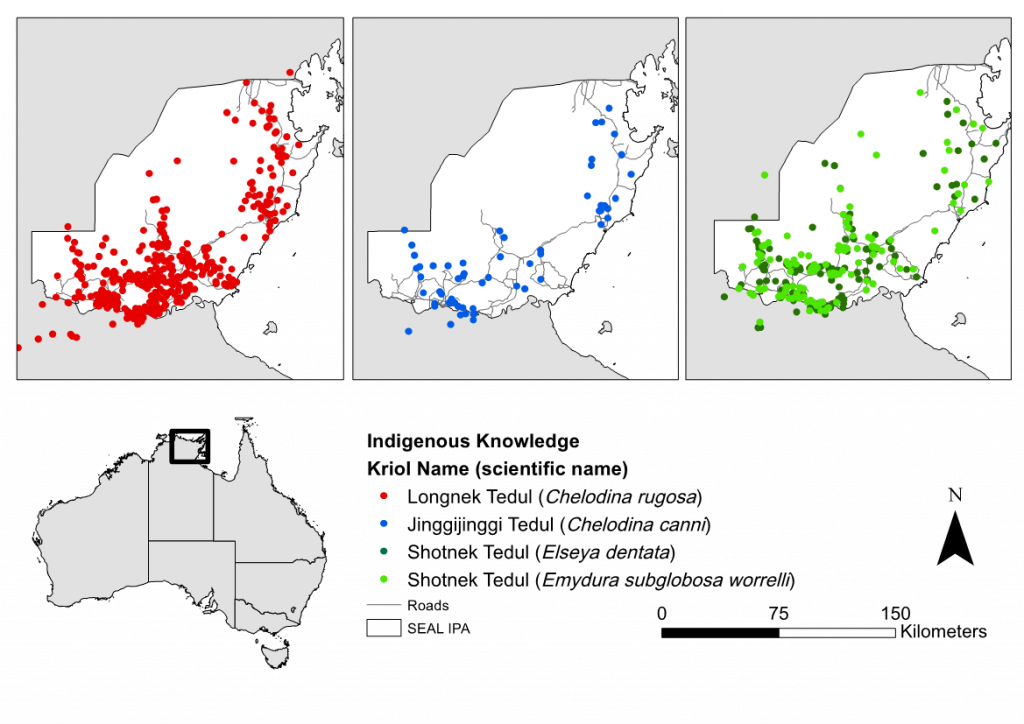 This was the first time Indigenous accounts of species occurrences were contributed as data points to the Atlas of Living Australia. With the consent of Indigenous Holders, Indigenous knowledge such as this has the potential to contribute valuable information to national databases, especially for culturally significant species that people have strong connections with. Although we’ve added hundreds of data points from Indigenous people’s memory of turtle hunting in their lifetimes, the accompanying biocultural knowledge shared by knowledge holders reinforces the global conservation concern of freshwater turtle decline.