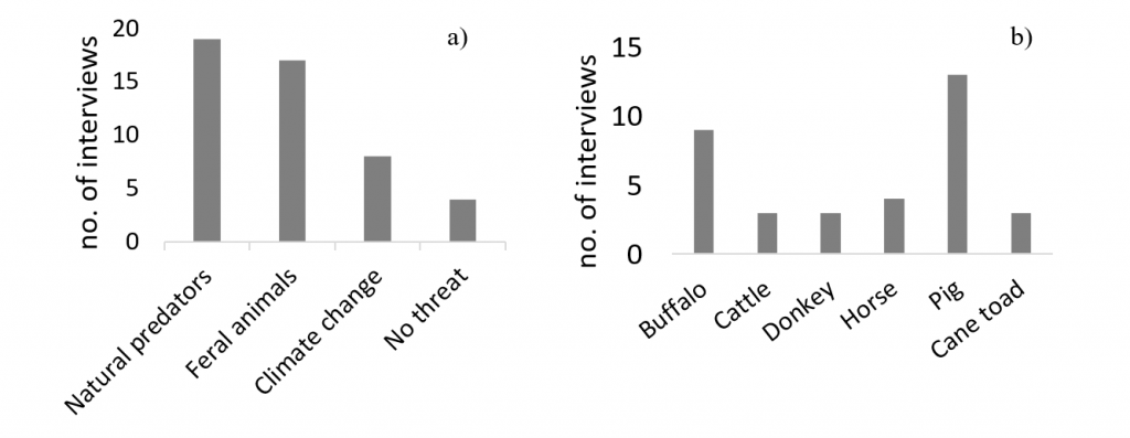 Of the feral animals, pigs (n=13) were most often mentioned as a threat to freshwoda teduls, followed by feral water buffalo (n=9), horse (n=4), donkey (n=3), cattle (n=3) and cane toads (n=3). As stated by several knowledge holders, pig and buffalo were considered the most damaging feral ungulates as they trample and eat aestivating freshwoda teduls.